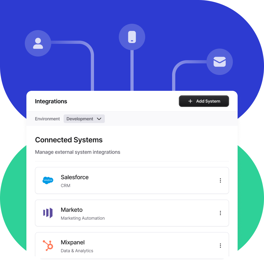 Connect to any business system—from Salesforce to legacy ERPs—via webhooks or custom connectors, creating a true 360° view of your customer.